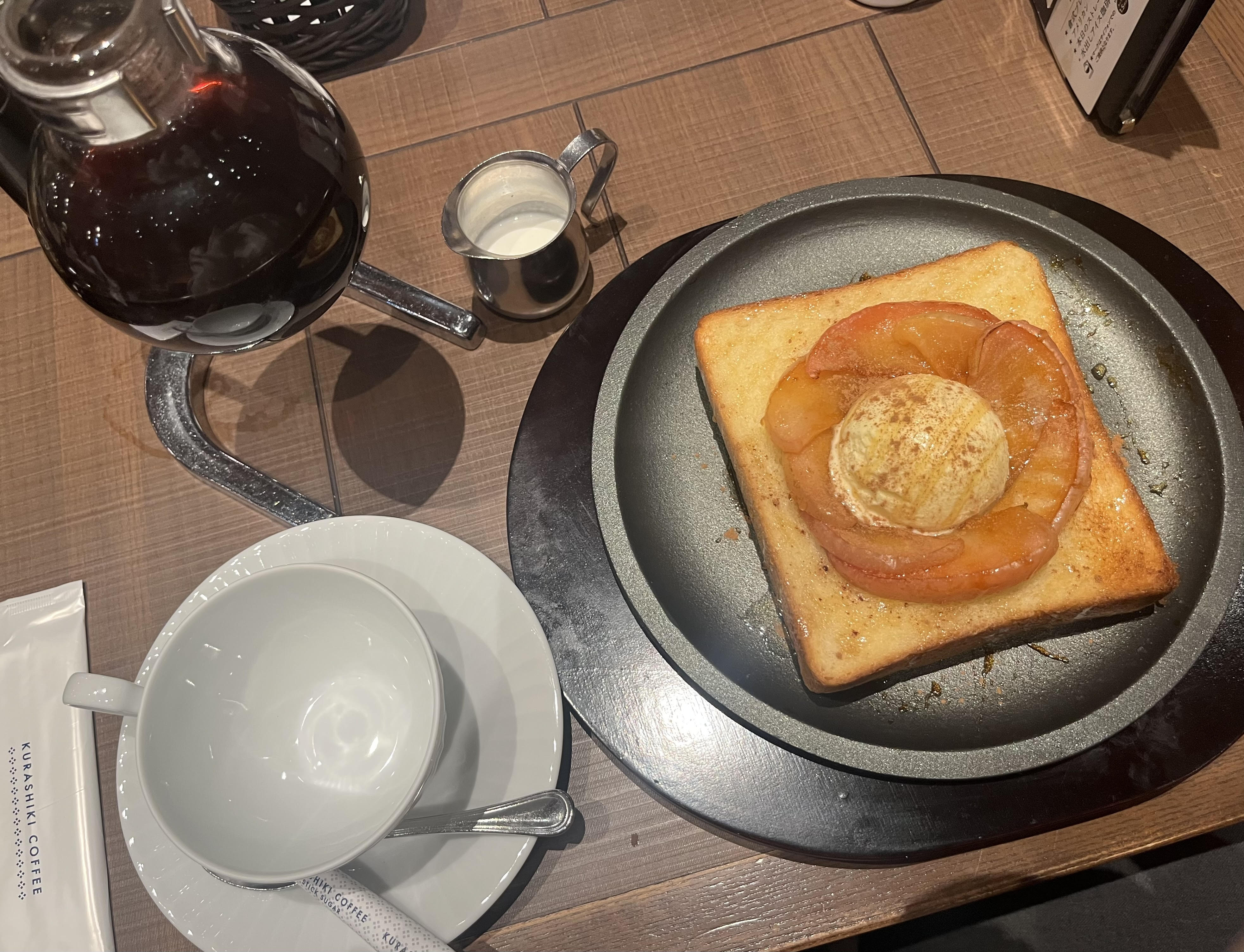 今回私は倉式ブレンドと焼きりんごトーストをいただきました。倉式ブレンドはサイフォンで淹れた香りがふわっと広がり、軽やかで飲みやすい口当たり。食事の合間にもすっと馴染む味わいで、思わずおかわりしたくなるほどでした。