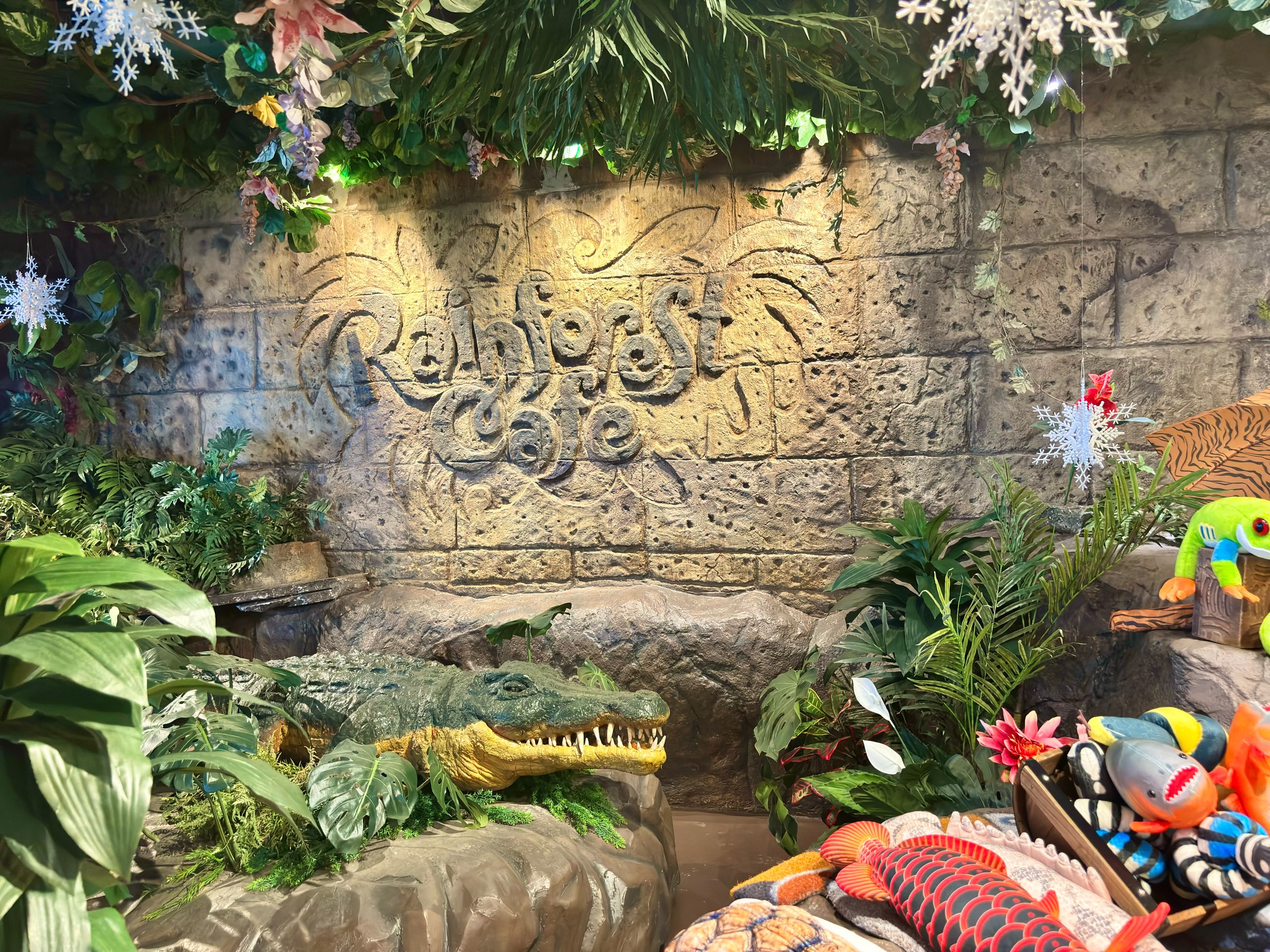 入口でワニが出迎えてくれるこのお店、2階部分はかわいい動物たちのグッズを売っているショップで、1階部分はレストランとなっています。「レインフォレスト」の名の通り熱帯森林を再現しており、沢山の植物に雷の音、巨大な水槽や本物の様に動く動物たちを見る事が出来ます。