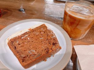 私はちょうど夕方のカフェタイムに行ったので、キャロットケーキとアイスラテを注文しました!