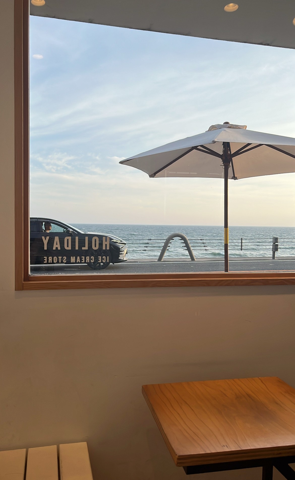店内にテーブル席とお店の外にベンチがあり、どちらからでも海を眺めながらアイスをいただくことができます。